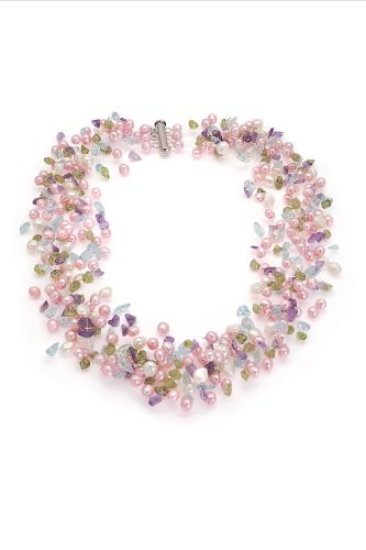 A very feminine and eye-catching pastel choker necklace of pink, white and creme colored freshwater pearls accented by chips of natural amethyst, aquamarine, and pale green citrine chips on a fourteen strand nylon thread with a barrel-style clasp. Elegant and fresh. Imported from Italy.Available at Amazon Check Price Now!